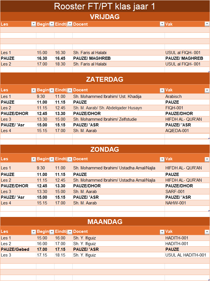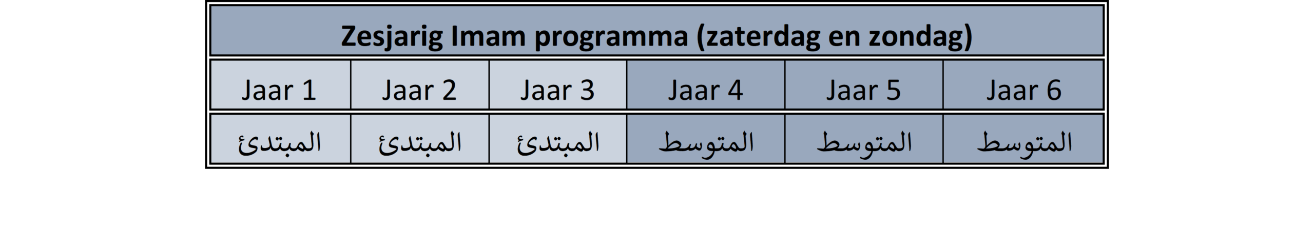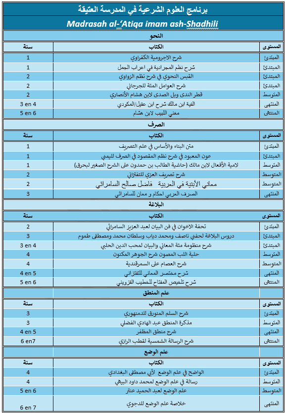 Wil jij een hoog niveau in alle islamitische wetenschappen bereiken en ben je geïnteresseerd in deze opleiding? Maak je interesse dan kenbaar voor Madrasah al-‘Atiqa imam ash-Shadhili en begin aan een reis vol wijsheid en betekenis! Hieronder vind je het volledige curriculum van de Imam opleiding (jaar 1-4) en ‘Alim opleiding (jaar 5-7), let op bij het parttime programma worden de eerste vier jaar van het fulltime programma verdeeld over de zes jarige parttime opleiding.
